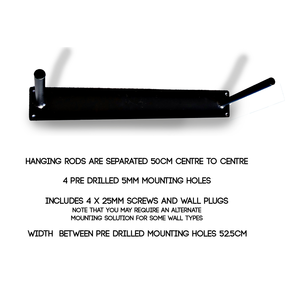 A high quality steel tube and plate, welded and powder coated in charcoal black, steel bracket for hanging AOK Exercise Mats with Eyelets. The tube holders are spaced at 50cm (centre to centre) Made from 2.5mm x 54.5cm long flat bar and 18mm steel tube they will hold 10 x 15mm mats. They have 4 pre-drilled 5mm mounting holes suitable, and include 4 x 25mm screws and wall plugs suitable timber stud walls. The centres of these predrilled holes are 52.5cm apart. You may need to redrill for larger Dynabolts for masonry walls.